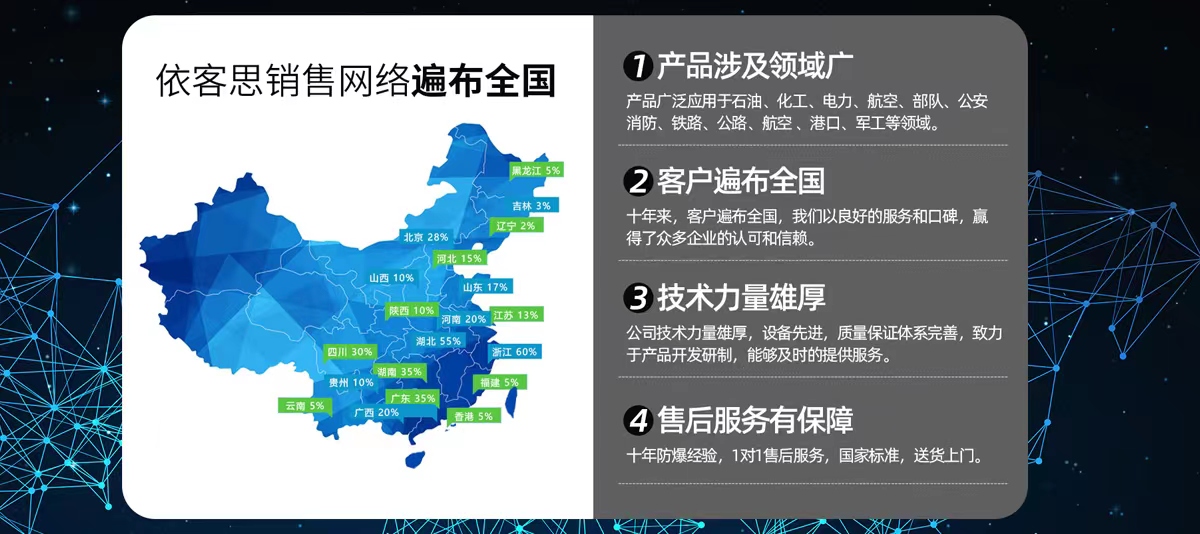 依客思防爆專(zhuān)注于防爆產(chǎn)品的研發(fā)、生產(chǎn)與銷(xiāo)售,主要產(chǎn)品有:防爆操作柱、BXCQ防爆靜電釋放儀、BZC系列防爆操作柱、不銹鋼現(xiàn)場(chǎng)操作箱、BXM(D)防爆照明(動(dòng)力)配電箱、BXX防爆檢修箱、BXJ防爆接線(xiàn)箱、LED防爆燈、防爆管件、防爆風(fēng)機(jī)等產(chǎn)品,型號(hào)規(guī)格齊全,廣泛適用于煤炭、電力、醫(yī)藥、石油、化工、航空等領(lǐng)域。我公司產(chǎn)品質(zhì)量過(guò)硬,價(jià)格實(shí)惠,銷(xiāo)售范圍廣,且與各大型企業(yè)建立了良好的合作關(guān)系,同時(shí)還遠(yuǎn)銷(xiāo)中、東亞和北美等地區(qū),深受用戶(hù)喜愛(ài)與青睞。
