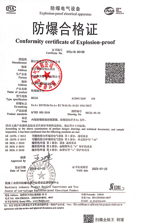 產(chǎn)品認(rèn)證:生產(chǎn)廠家制造的防爆電氣產(chǎn)品是否合格,是否滿足危險場所規(guī)定要求,必須通過國家及國際指定檢測單位進(jìn)行產(chǎn)品的爆炸試驗和相關(guān)防爆性能測試。但是檢測中心只是對送檢的樣品是否合格給予判定。用戶選擇安全的產(chǎn)品首先檢查防爆合格證,如何判定防爆合格證是否屬于國家指定檢測單位出具的報告,可以到檢測中心的官網(wǎng)上查詢防爆證號是否屬實。其次由制造單位提供產(chǎn)品樣品,使用單位委托第三方檢測。國際認(rèn)證的產(chǎn)品不只是針對產(chǎn)品檢測,更重要的是檢查制造單位的生產(chǎn)設(shè)備加工能力以及體系運行保證產(chǎn)品質(zhì)量符合檢測規(guī)定。確保使用者放心,省心。對沒有加工能力的企業(yè)不予防爆合格證的發(fā)放。