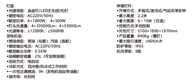 如本產(chǎn)品的標(biāo)準(zhǔn)配置不能滿足客戶的工作需要,我可在燈盤的燈頭數(shù)量功率、泛光或聚光類型、伸縮氣桿的升起高度、發(fā)電機(jī)組的配備及油箱容量上按客戶要求做出調(diào)整,以滿足客戶的個(gè)性化需求。